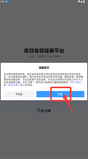 1、在提示页面点击同意选项,完成用户协议与隐私政策确认。