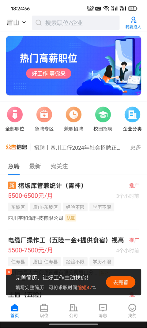眉山人才网是眉山地区专业的求职招聘平台,汇聚海量本地优质职位与人才资源,为企业和求职者搭建高效沟通桥梁,凭借精准的职位匹配算法,根据求职者技能、经验和求职意向,快速推荐合适岗位,助力求职者找到理想工作,专注眉山地区人才市场,深入了解本地企业需求和求职者特点,提供更贴合实际的求职招聘服务。