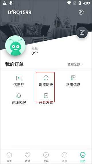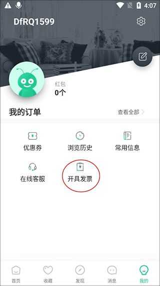 我们进入到【我的】个人界面,在界面里点击开具发票。