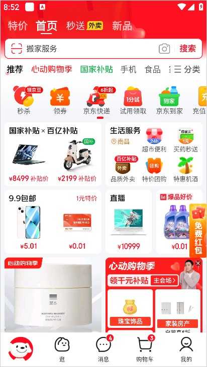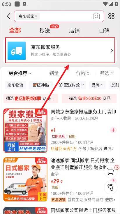 1、京东搬家是京东App内的一个功能,所以咱们在上方搜索框直接搜索【京东搬家】