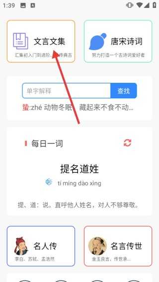 1、在首页点击【文言文集】,进入文言文专题页面。