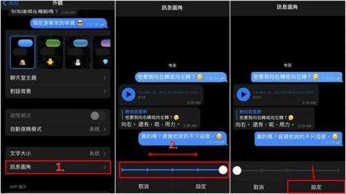 3、另外,你也可以调整「消息文字框」的样式;进入「外观」>「消息圆角」,即可左右滑动横杆,选择方一点、或圆一点的消息框外观喔!