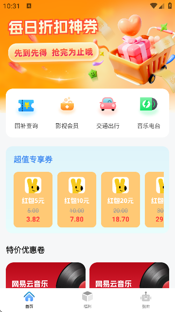 4、当中能提供国补查询功能,能领取影视,音乐APP的折扣会员红包以及美团的超值专享券。