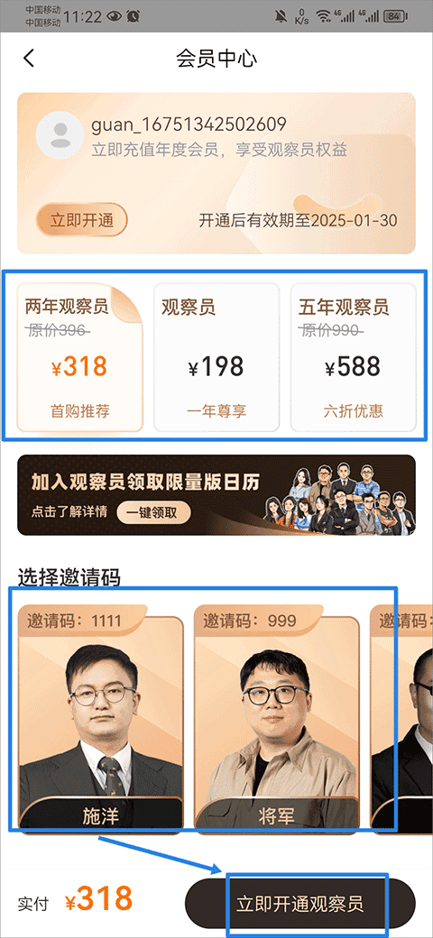 2、进入后按照自己的需求进行开通即可成为观察员,另外选择邀请码后还可为你减少一定金额优惠哦