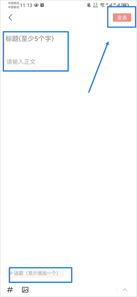 2、进入后将文章标题与正文编辑完成后,选择一个话题后点击右上角发表即可