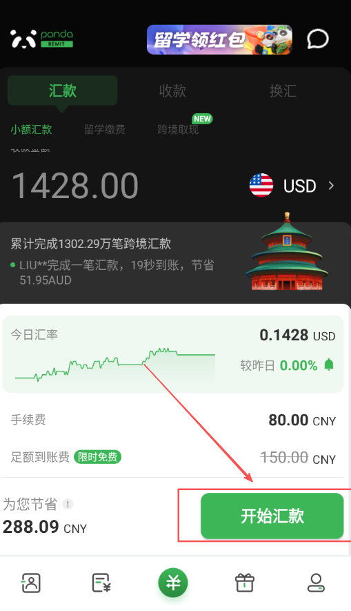 3.汇款类型:熊猫速汇满足您的各种汇款需求,不仅能够实现小额、大额汇款、国际汇款,同时还支持人民币汇出(人民币兑换美元/港币/欧元/澳元/加币等)、留学缴费(支持留学生支付海外学校的学费/生活费/报名费等,已覆盖全球28个国家/地区)
