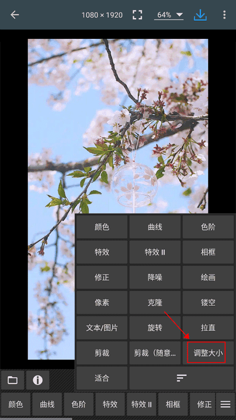 3、在编辑界面中点击右下角三横线,再点击调正大小