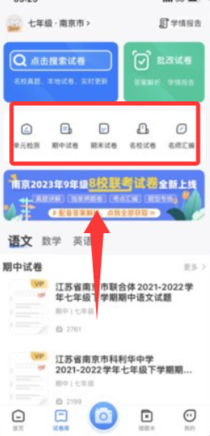 1、试卷搜索下载,在首页输入学科和年级关键词,筛选本地名校试卷,点击下载后自动存入我的试卷夹。
