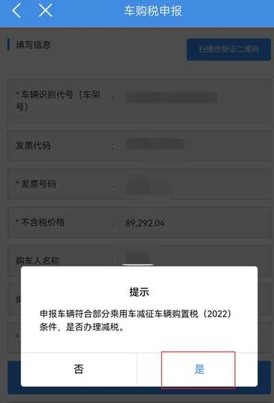 2、填写车辆识别代号(车架号),自动带出发票代码;填写发票号码,填写不含税价格,点击下一步,弹出如下提示框;
