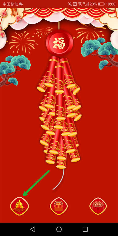 1、打开电子鞭炮app,进入页面后,点击页面底部左侧的如同火堆的图标(下图绿色箭头所指区域即可鸣放电子鞭炮)