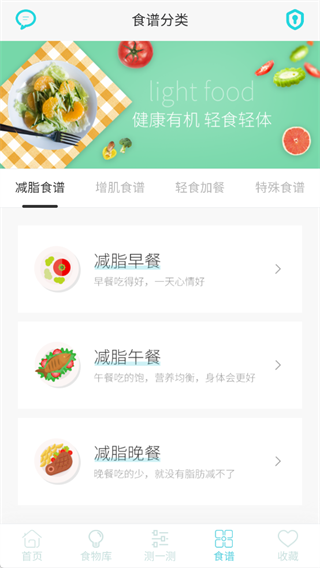 食谱板块按减脂、增肌等目标细分,还能查看减脂早/午/晚餐等具体餐单,图文步骤让你轻松上手做健康餐。