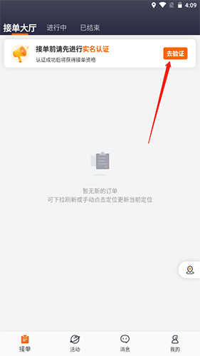 2、进入软件首页,用户需要完成使命认证和服务培训才能开通账号,进行接单,我们点击实名认证;