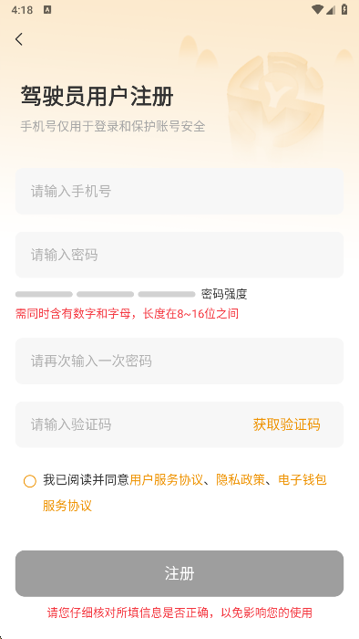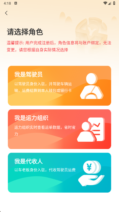 2、如果您是新用户,需要重新注册身份,在这里可以选择驾驶员,运力组织,以及代收人