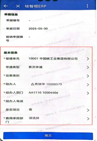 核智枢ERP>导航>国内出差派遣单>国内出差申请
