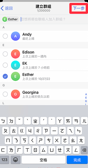 4、在成立 telegraph 群组时,至少要有两个成员在里面才能成立,因此这裡我们需要至少勾选一个你要邀请加入的 telegraph 群组的成员,然后点选「下一步」。