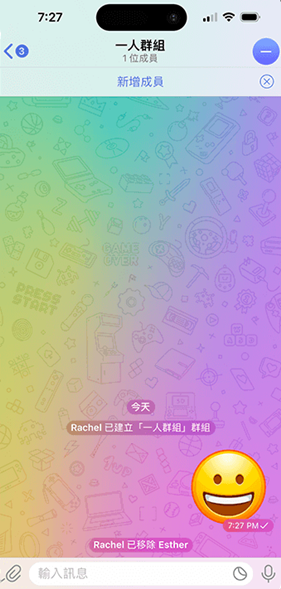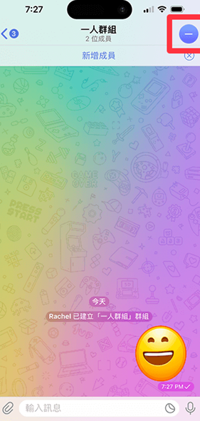 8、回到刚刚建立的群组,最上方会显示「1 位成员」,代表这个 telegraph 群组就只有你一个人,你所传送的照片、影片或档案等任何资料都只有你自己看得到,也只有你可以存取。