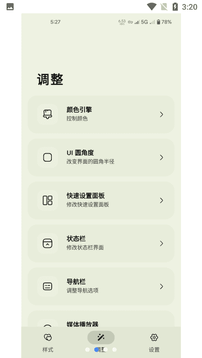 浏览分类:重启后进入 App,你会看到“颜色(Colors)”、“状态栏(Status Bar)”、“快速设置(Quick Settings)”等分类。