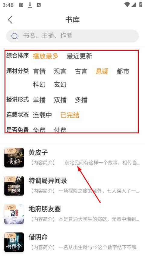 打开夜听书城后,找到页面右上角的筛选图标并点击,即可进入书库筛选页面。