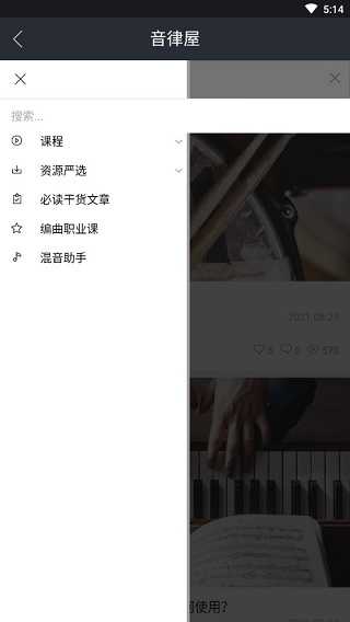 2、进入软件后,整个界面相对来说比较简洁,这点从软件大小就能分辨,但软件所提供的音乐教学及干货知识非常的专业且丰富,点击类似“三”一样的图标,可以看到课程里的相关内容,资源严选里的相关推荐,还有丰富的教学内容及视频讲解。此外,这里还有编曲职业课和混音助手,可再现编程你的音乐风格!