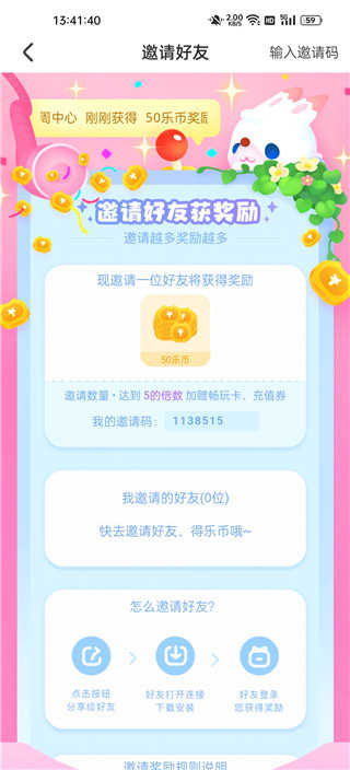 1、打开软件,点击邀请好友可以获取海量乐币,邀请达到数量更有畅玩卡、充值券