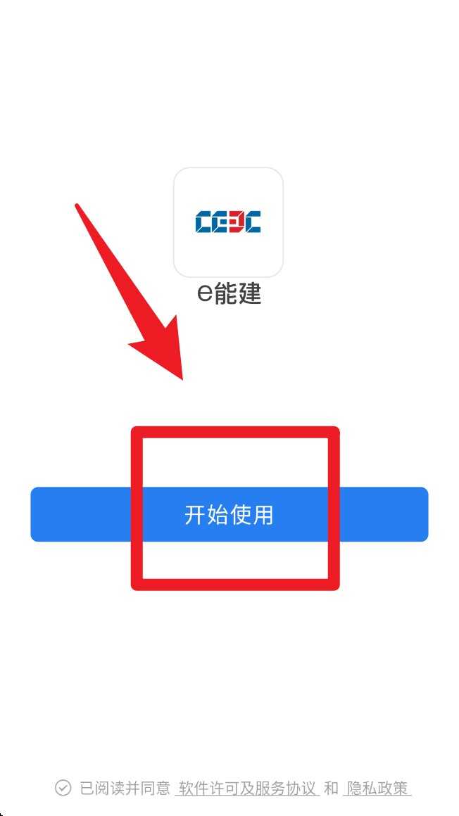 打开 App 后点击「开始使用」,正式进入 e能建 移动办公平台,需先完成登录验证流程。