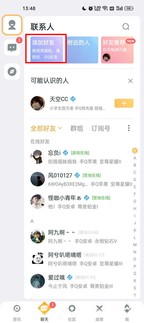 2、点击下方的聊天之后,会来到联系人页面,上方有三个端口,分别是添加好友、附近的人、好友推荐、选择添加好友,因为我们要查的是其他人的战绩。