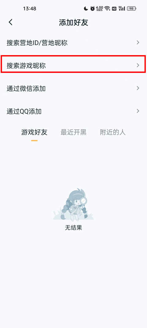 4、进入到添加好友页面之后,有搜索营地、营地昵称、搜索游戏昵称、通过微信添加、通过qq添加这四种查询方式,看哪种方式适合你。
