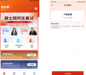 登录后进入到APP-首页,首页有各种面试的快速入口,学生可根据需要进行选择。选择面试岗位,完成面试、查看面试报告。