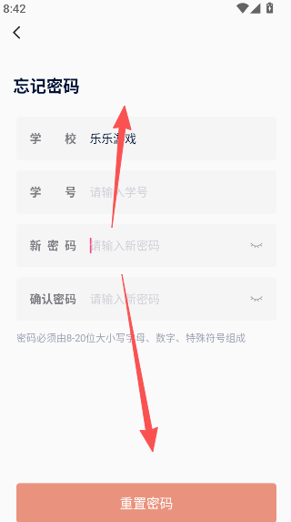 2、输入学校和在校学生用户们的学号,输入新密码完成重置操作。