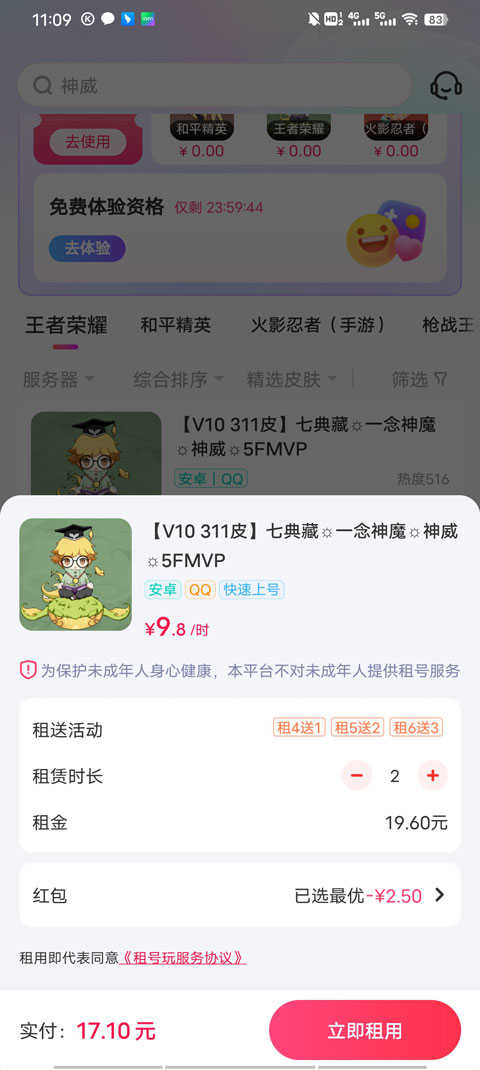 1、点击进入软件,选择你想要的游戏账号,点击租用;