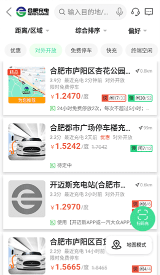 4、每个电站下方都有详情介绍具体的价格等信息,确定后点击下方的“扫码充电”;