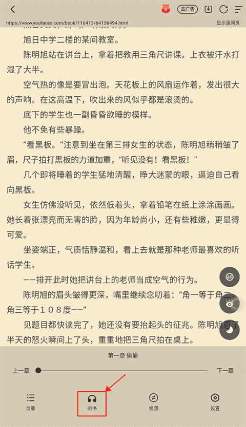 1、在小说阅读界面点击屏幕在底部会显示“听书”图标。