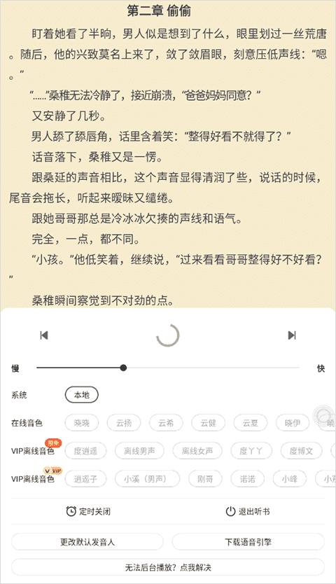 2、点击之后即可开始听书啦,你还可以在下方切换不同的音色听书哦~
