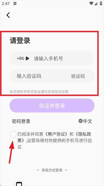 3、输入手机号和验证码,勾选用户协议和隐私政策即可