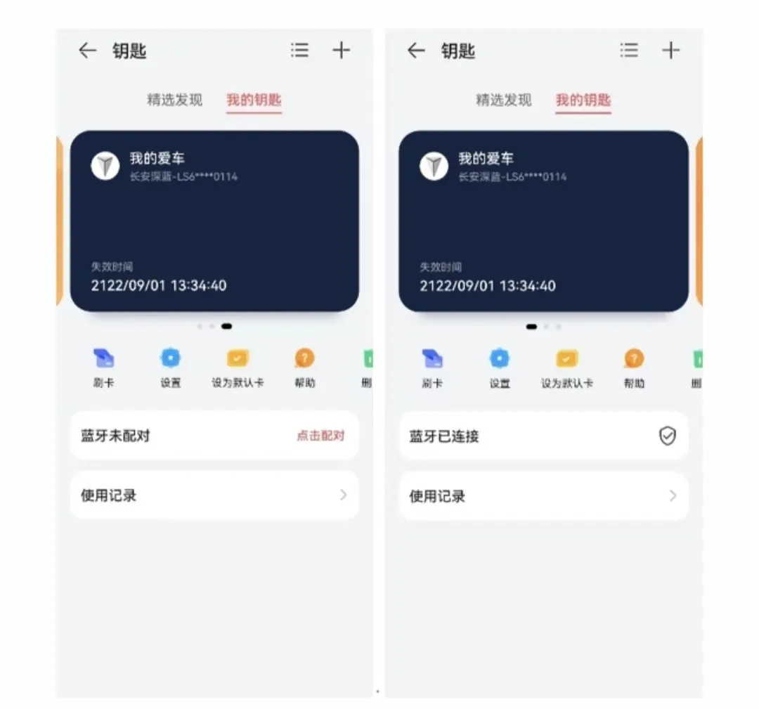 手机安装并打开深蓝App,靠近车辆附近10米范围内,在服务中打开数字钥匙点击当前车辆,点击添加, App界面会弹出“添加数字钥匙包”,选择“立刻前往”后跳转至华为钱包,点击“立即添加”,等待一分钟左右后开通钱包钥匙,开卡成功后,手动配对蓝牙,待钱包页面显示“蓝牙已连接”即表示开卡已成功。