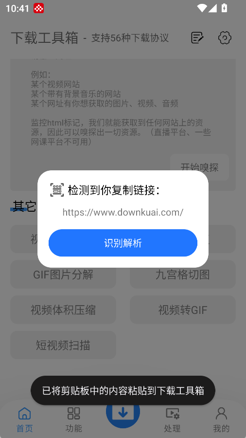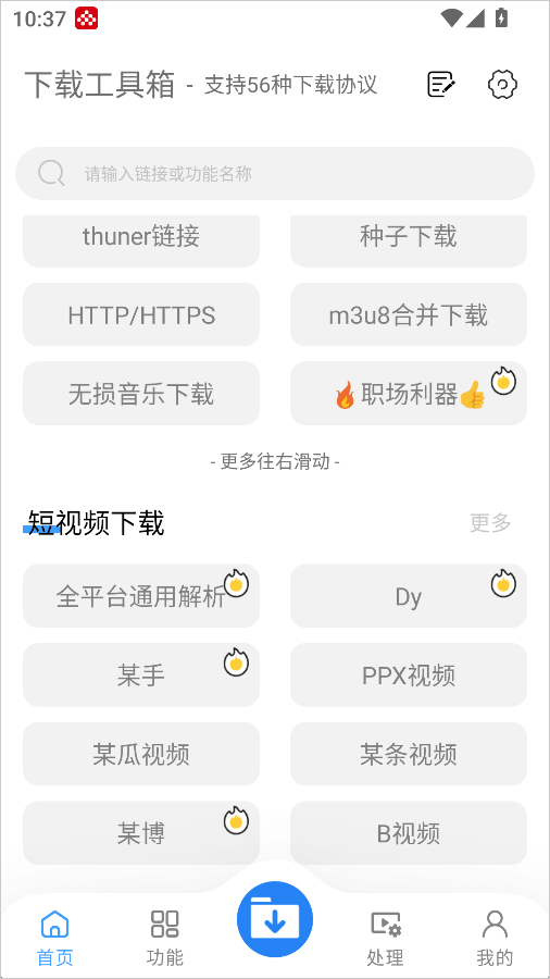 下载工具箱官网版是一款全能型内容抓取工具,支持从主流短视频、社交、音乐平台无水印下载视频、音频与图片,无需登录、不跳转第三方,一键解析高清资源,保留原始画质与音轨,操作简单高效,全程本地处理,无广告、无后台上传,保障用户隐私与设备安全。