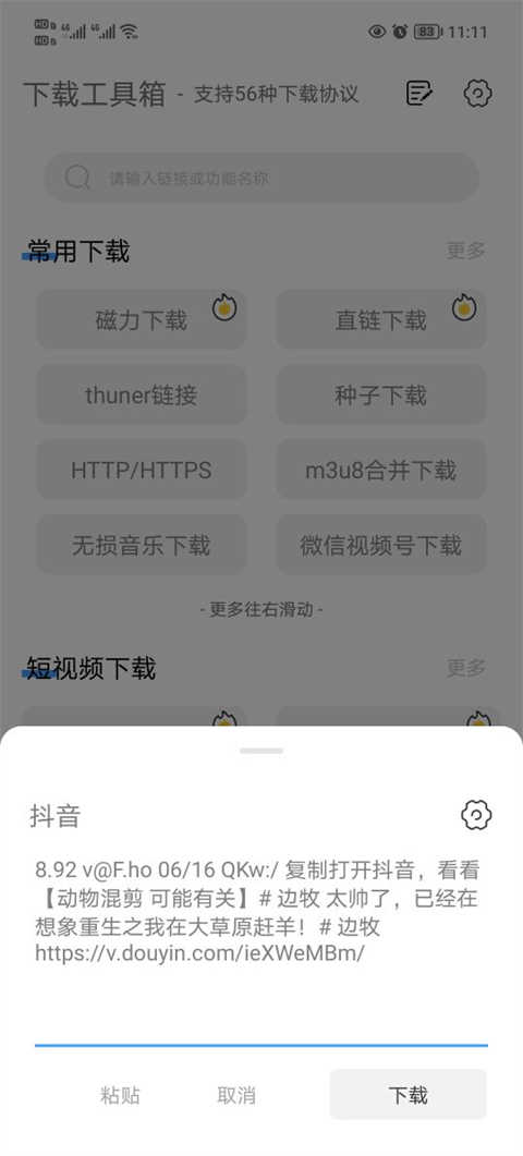 2、小编以抖音视频为例,将复制的抖音视频链接粘贴,点击下载。
