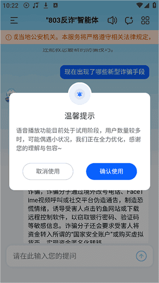 支持文字与语音双向输入,用户可随时咨询可疑信息,AI即时解析诈骗类型并给出防范建议。