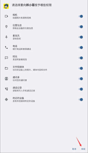 1、初次启动应用时,系统会申请必要权限,点击"继续使用"完成授权即可。