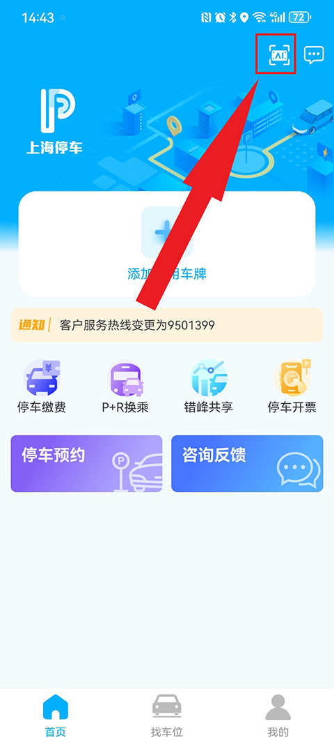 3、用户也可以通过扫描车牌来进行快捷添加车牌号,在首页点击右上角的“扫描”图标即可。
