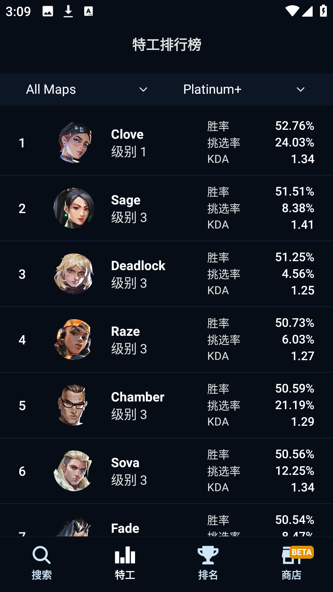 查看任意地图或排行榜每个Valorant特工的全球洞察数据,如每个人的胜率。您还可以详细查看他们的统计数据(包括逐渐升高的KDA或选择率)。