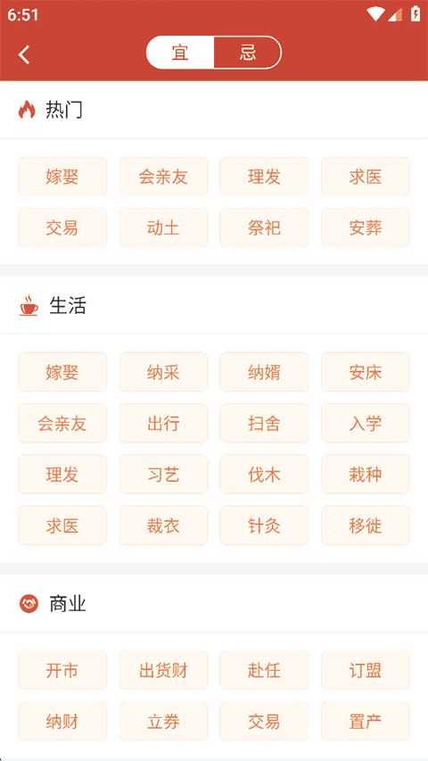 1、日历:黄历宜忌、节日节气、吉日查询、历史查询;