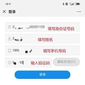 在弹出的登录页面,依次填写“身份证号码”、“姓名”、“手机号码”,并点击发送验证码,填入接收到的验证码,点击“登录”按钮。