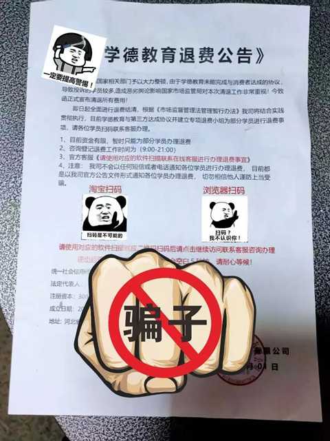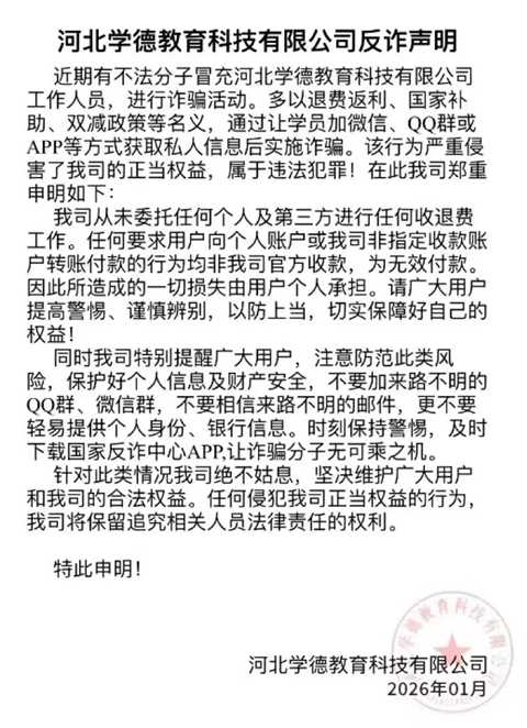 近期有不法分子冒充河北学德教育科技有限公司名义,进行诈骗活动。多以退费返利、国家补助、双减政策等名义,通过让学员加微信、QQ群或APP等方式获取私人信息后实施诈骗。该行为严重侵害了我司的正当权益,属于违法犯罪!在此我司郑重声明如下: