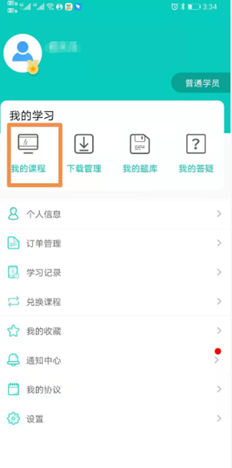 2、下载好后,首页如下图点击我的,然后点击我的课程,点击去学习,点击学习,就可以开始看视频了。