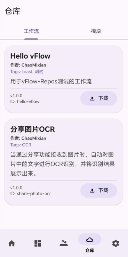 3、点击仓库能够对工作流和模块进行下载