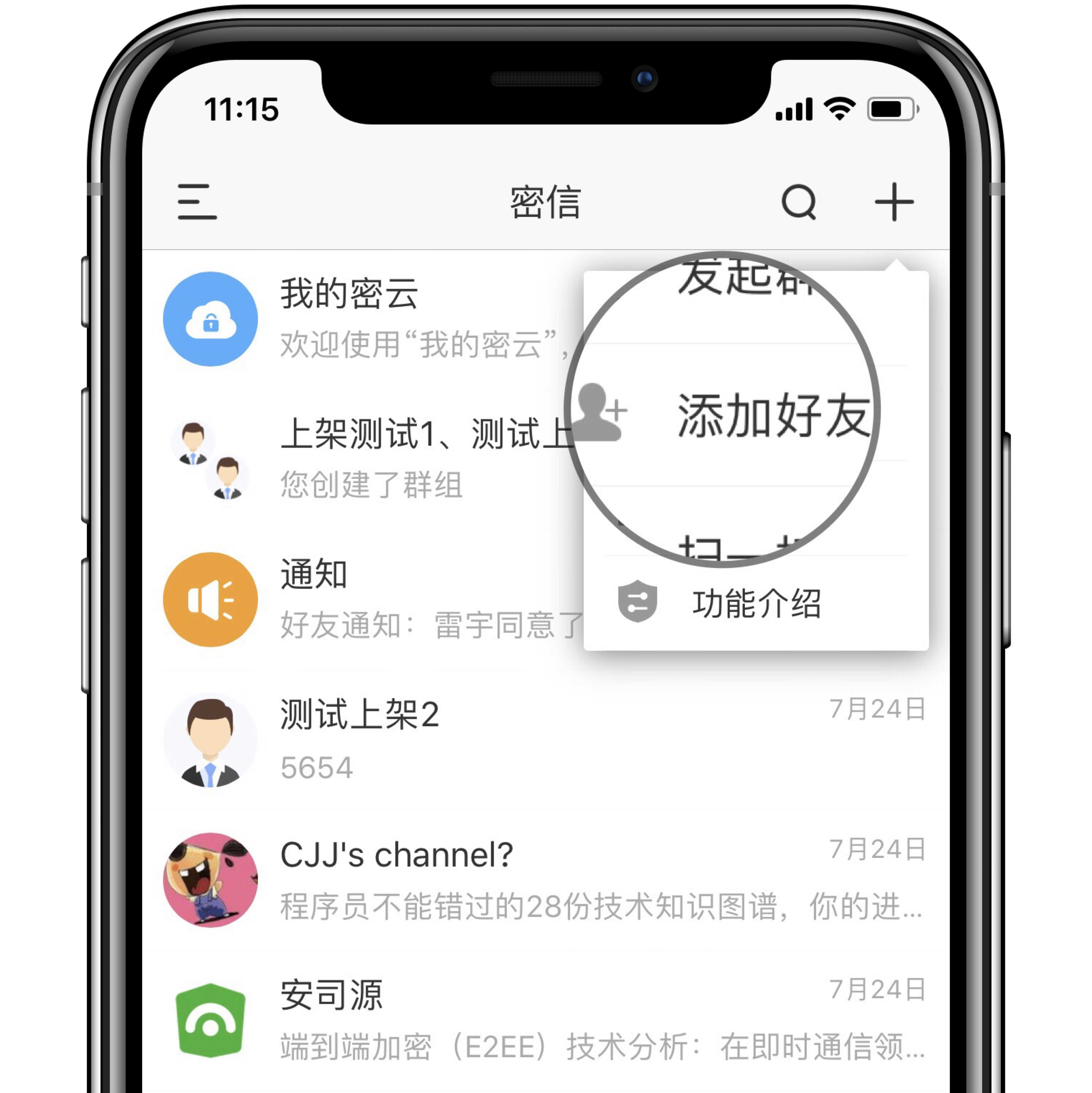 APP主界面点击右上角'+',选择添加好友(搜索手机号/密信号/昵称),输入搜索内容后再点击在服务器上继续搜索;或右上角'+'中选择扫一扫,扫描对方的二维码