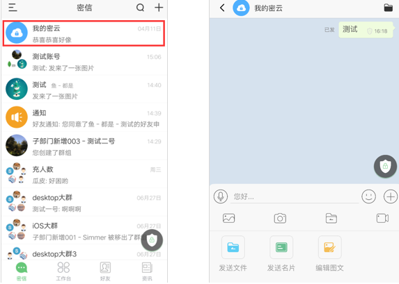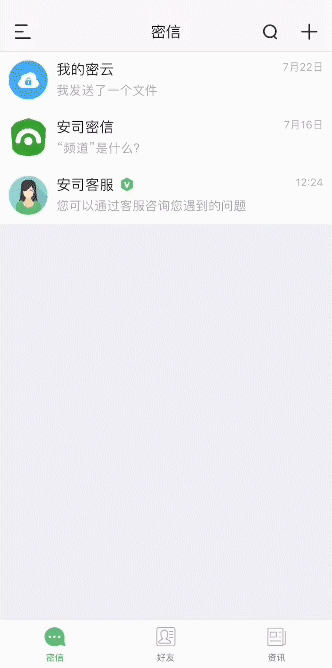密信初始登录后默认开启安全模式,并且只有在安全模式下才能进行即时通讯,通过点击右下角的盾图标或者长按主界面顶部可进行安全模式的切换。非安全模式下,所有的聊天数据,包括我的密云和通知消息等都会被隐藏