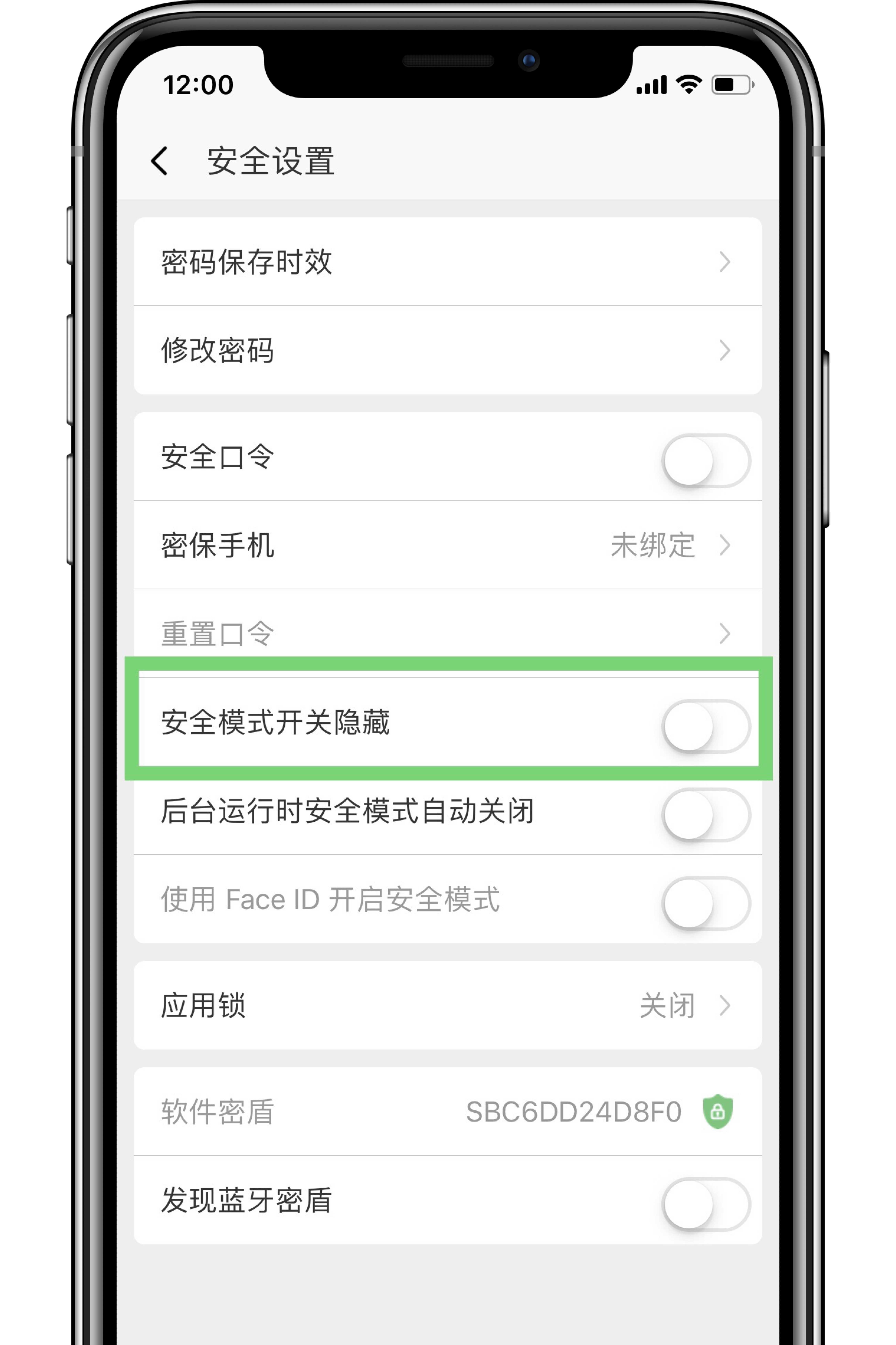 隐藏该开关后,您可以在APP主界面长按顶部绿色区域,即可开启/关闭安全模式