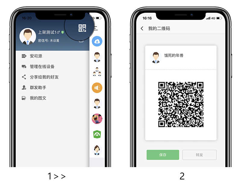 APP主界面从屏幕左端向右滑动,轻点页面上端的二维码图标,可选择保存至本地或者分享给密信联系人